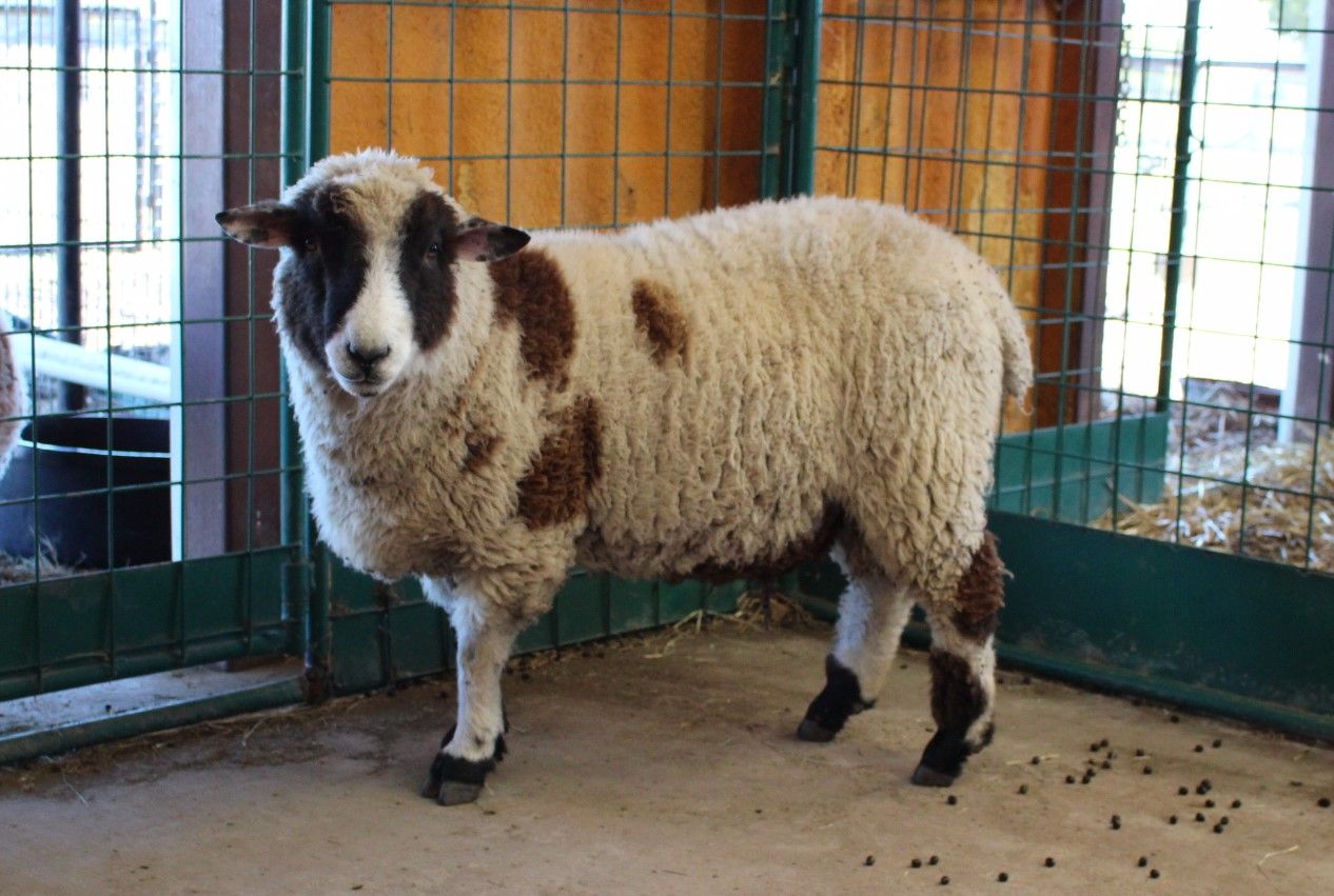 !Harlequin sheep standing in a pen.