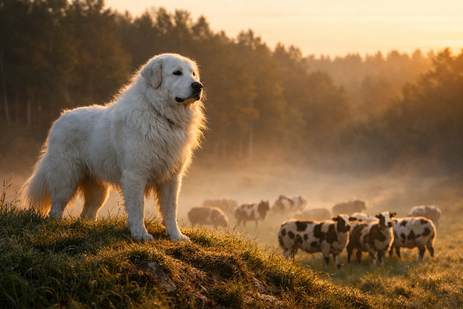 !Mature livestock guardian dog protecting a flock of Harlequin sheep in a misty morning pasture.